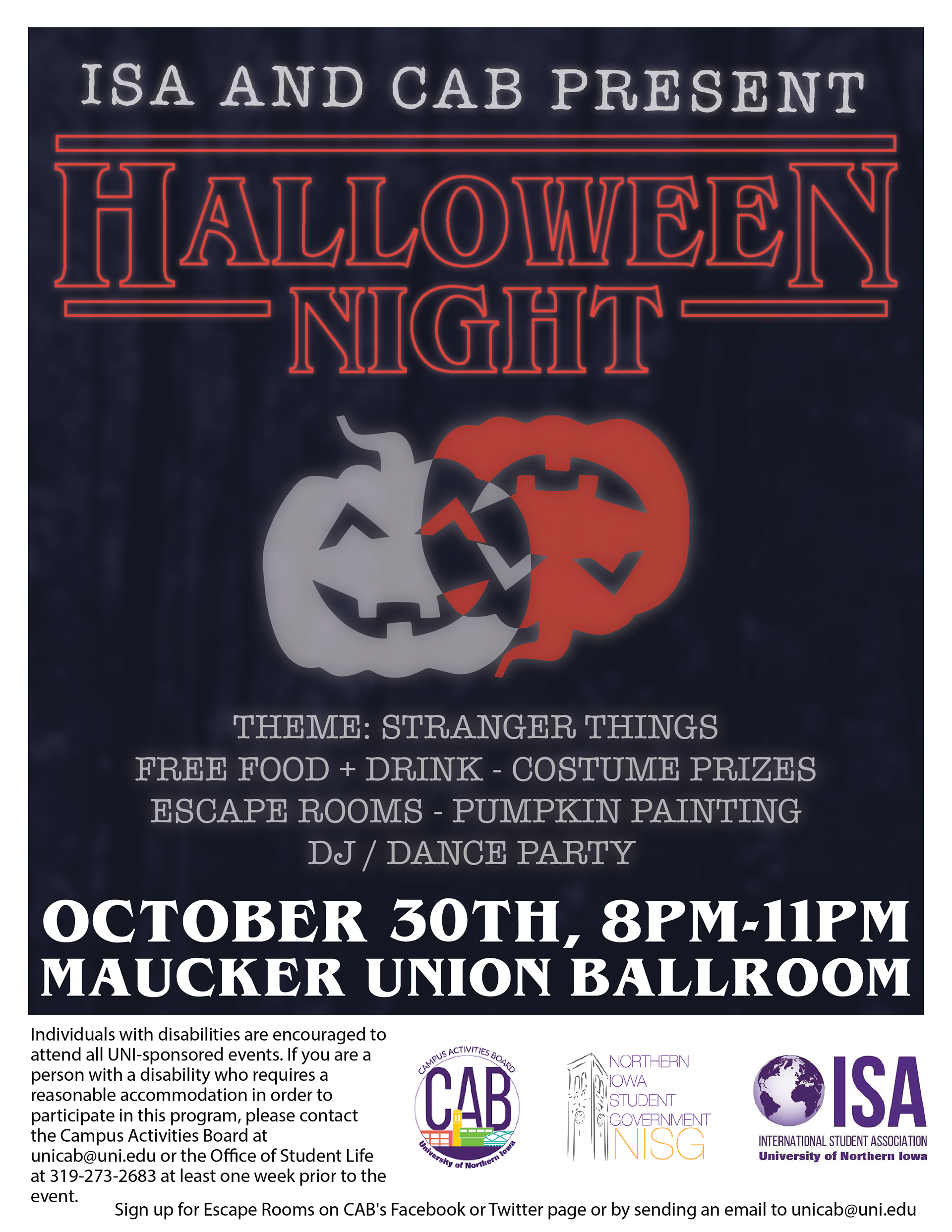 The first poster was requested by the International Student Association for their "Once Upon a Time" dance. The second was done for the UNI Interfraternity Council, for gender violence bystander training.