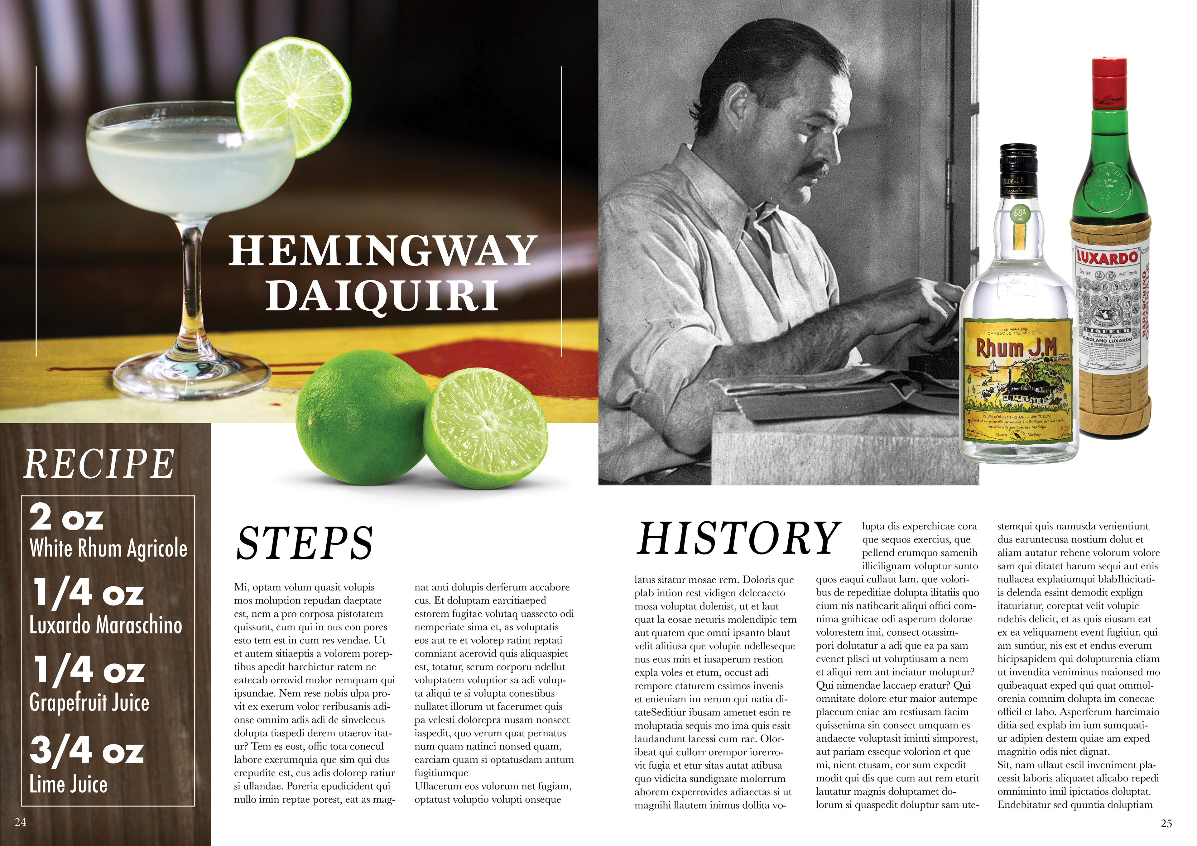 This was a school project done for my Publication Design class in 2020. The assignment was to design a cover and three spreads of a magazine. I created Limewheel Cocktail Magazine. Before this project, I hadn't done a publication design that was as photo based, so it took practice before I was able to balance text with photos or even on top of photos. Some elements were done in Adobe Illustrator and the project was assembled in Adobe InDesign.