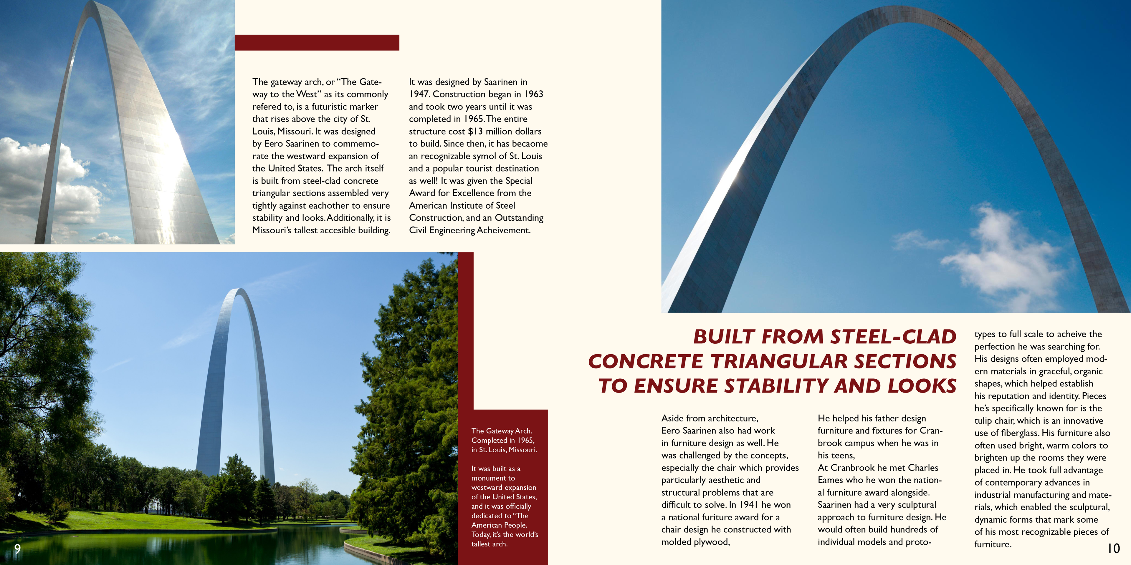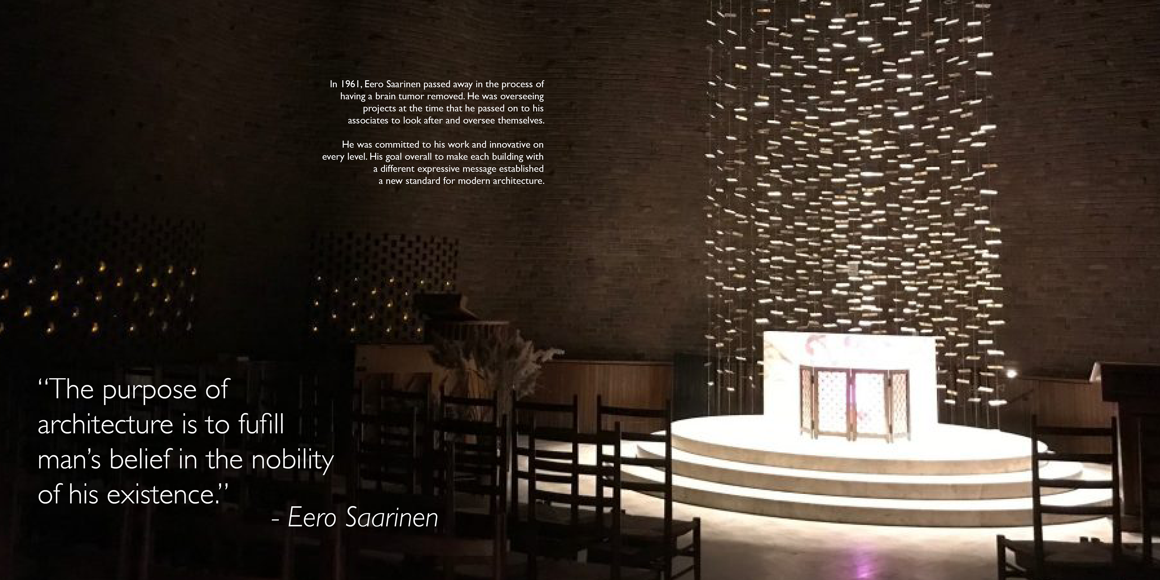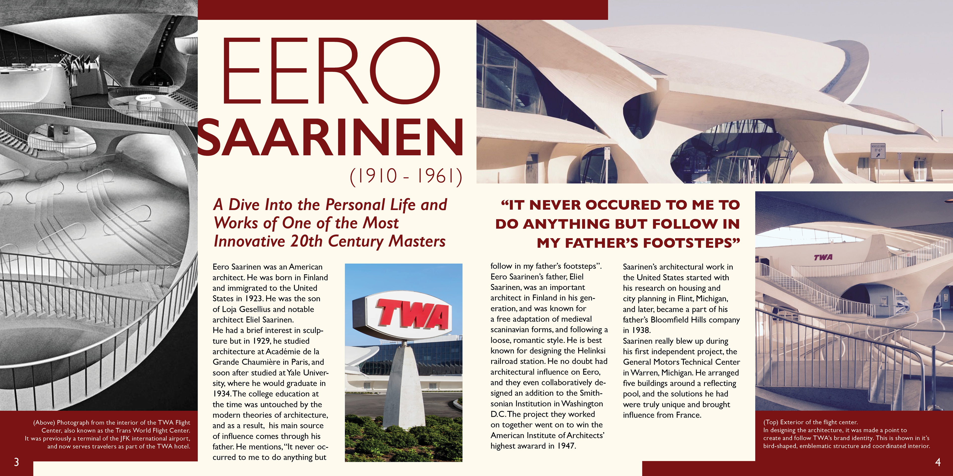This was a school project done for my Publication Design class in 2020. The assignment was to design materials including a poster and a booklet for an exhibition dedicated to an assigned architect. My architect was Eero Saarinen, so I had to do a lot of research about his work and style. This project challenged me because I hadn't designed publication this long before, and it took work before I was able to carry on the visual identity for every page. The poster was made in Adobe Illustrator and the booklet was made in Adobe InDesign